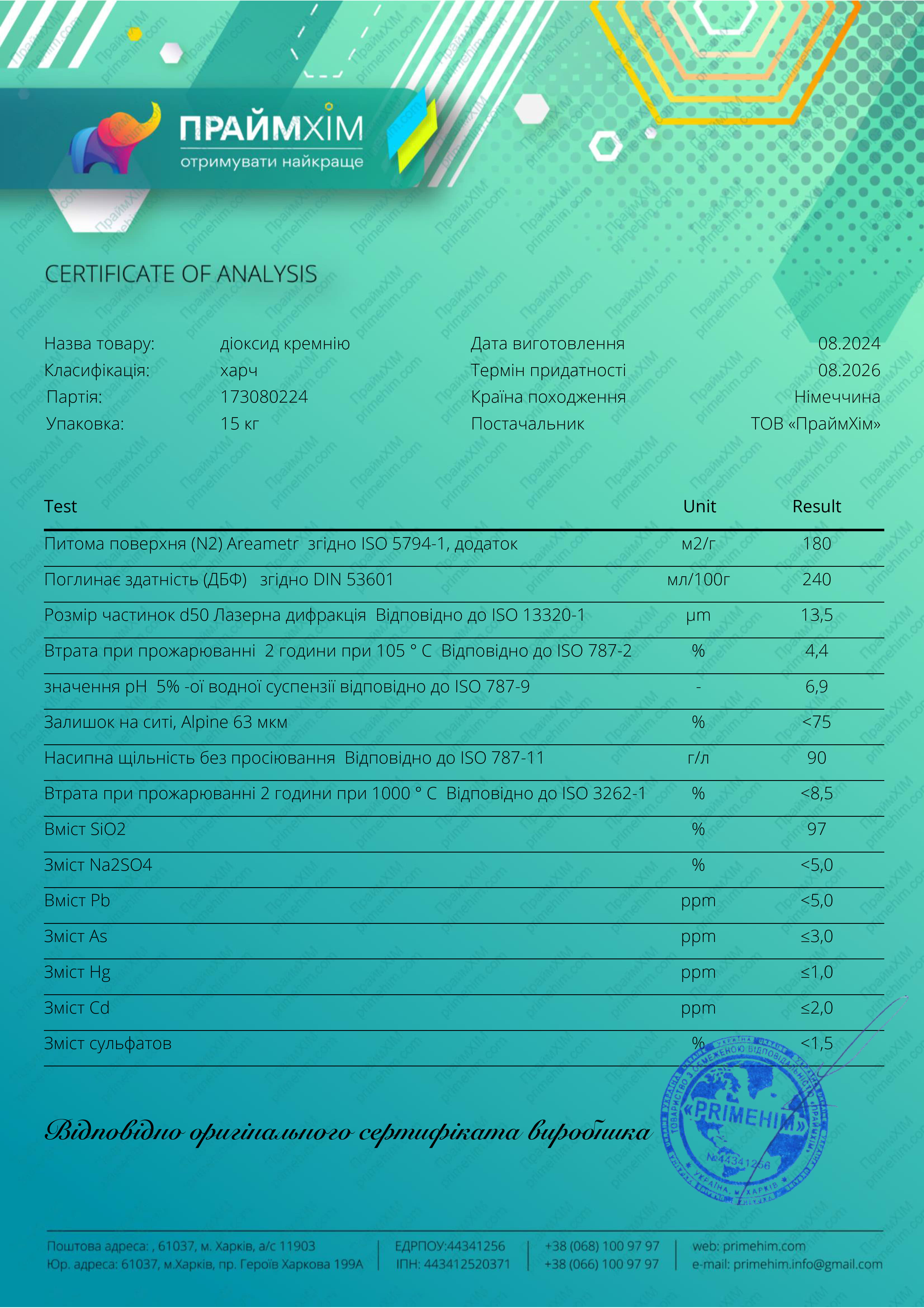 · Внешний вид: Очень легкий, объемный порошок белого цвета, без вкуса и запаха.
