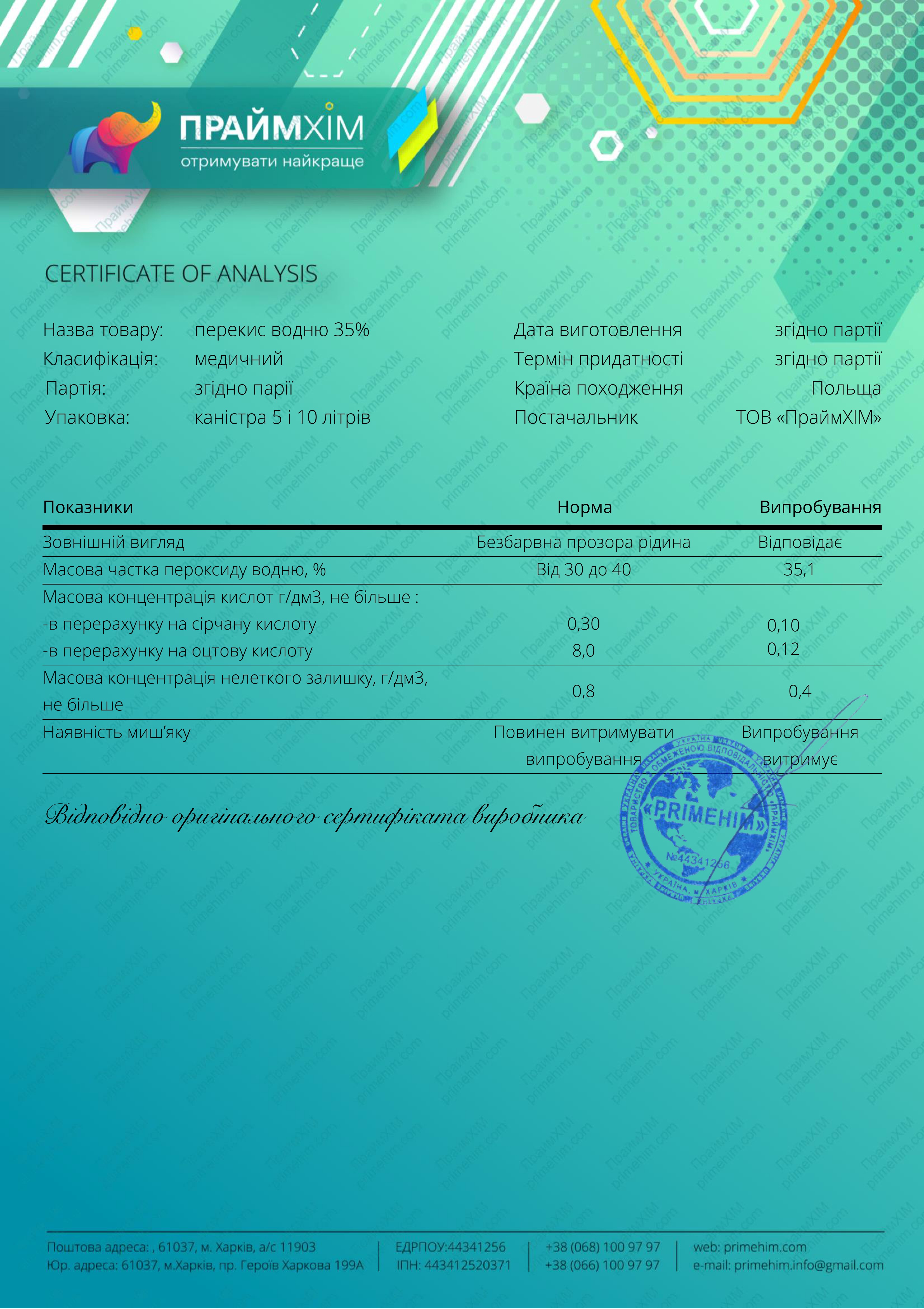Перекись водорода поставляется в прочных и герметичных канистрах объемом 5 литров, что обеспечивает удобство транспортировки и хранения.