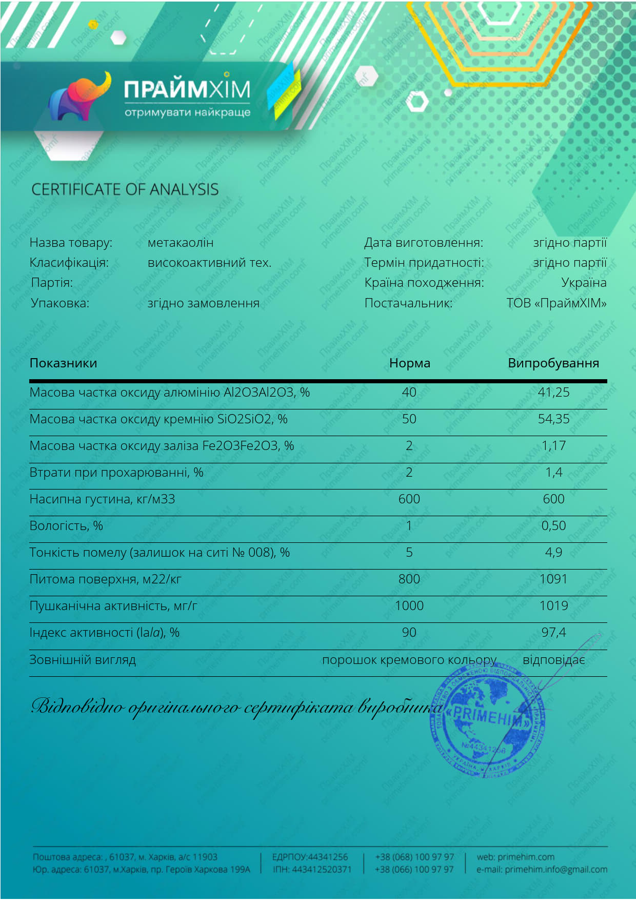 ВМК легко связывает в нерастворимые соединения любые щелочи. В состав метакаолина присутствуют оксиды кремния (около 53 %), алюминия (35–43), кальция (0,45), титана (до 0,6) и железа (0,75). Растворимость вещества в воде составляет 0,13 %, показатель отражения – 77,5, абразивность – порядка 80 мг, рассыпчатость – 100 %.