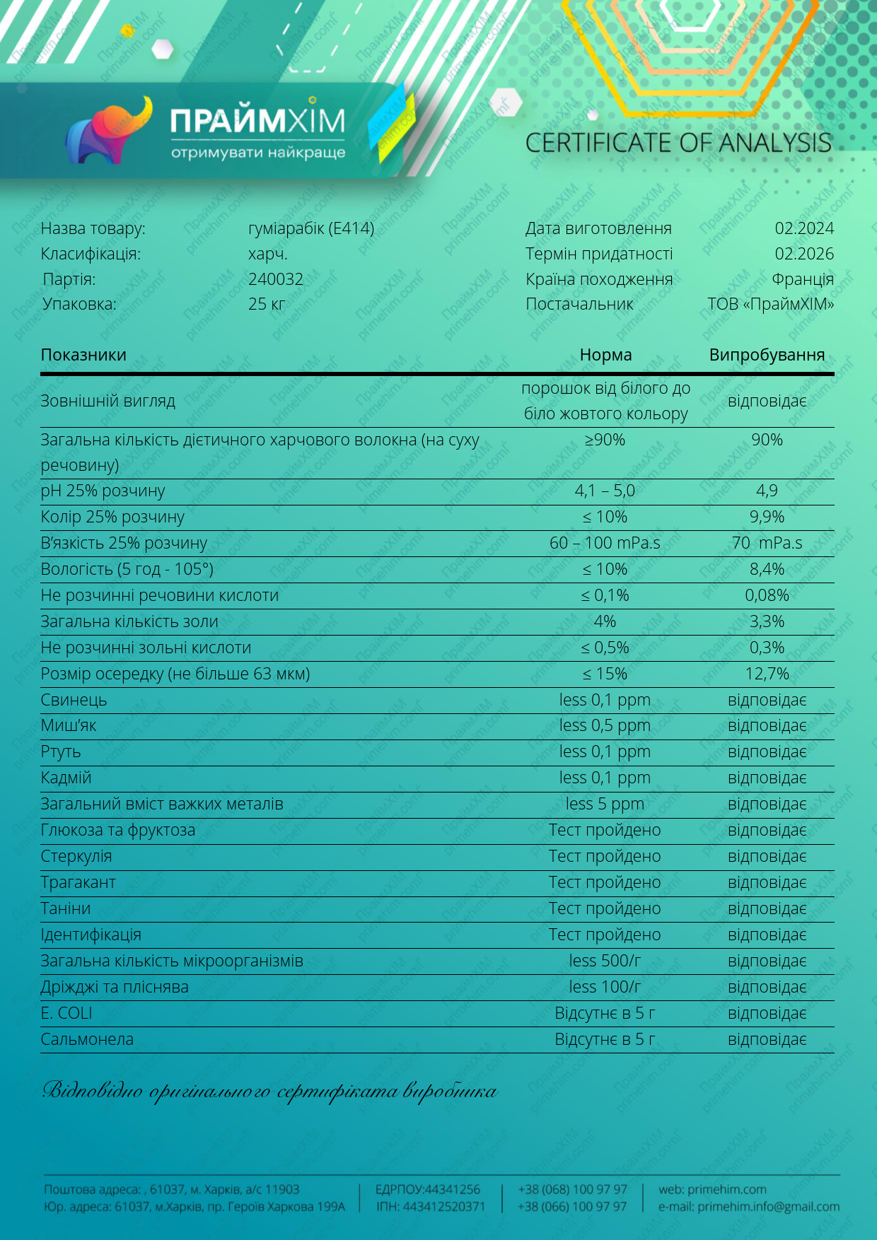 Гуміарабік (Е414) є однією з найбезпечніших і широко вивчених харчових добавок натурального походження. Ми поставляємо продукт високої якості, що відповідає всім вимогам харчової безпеки.