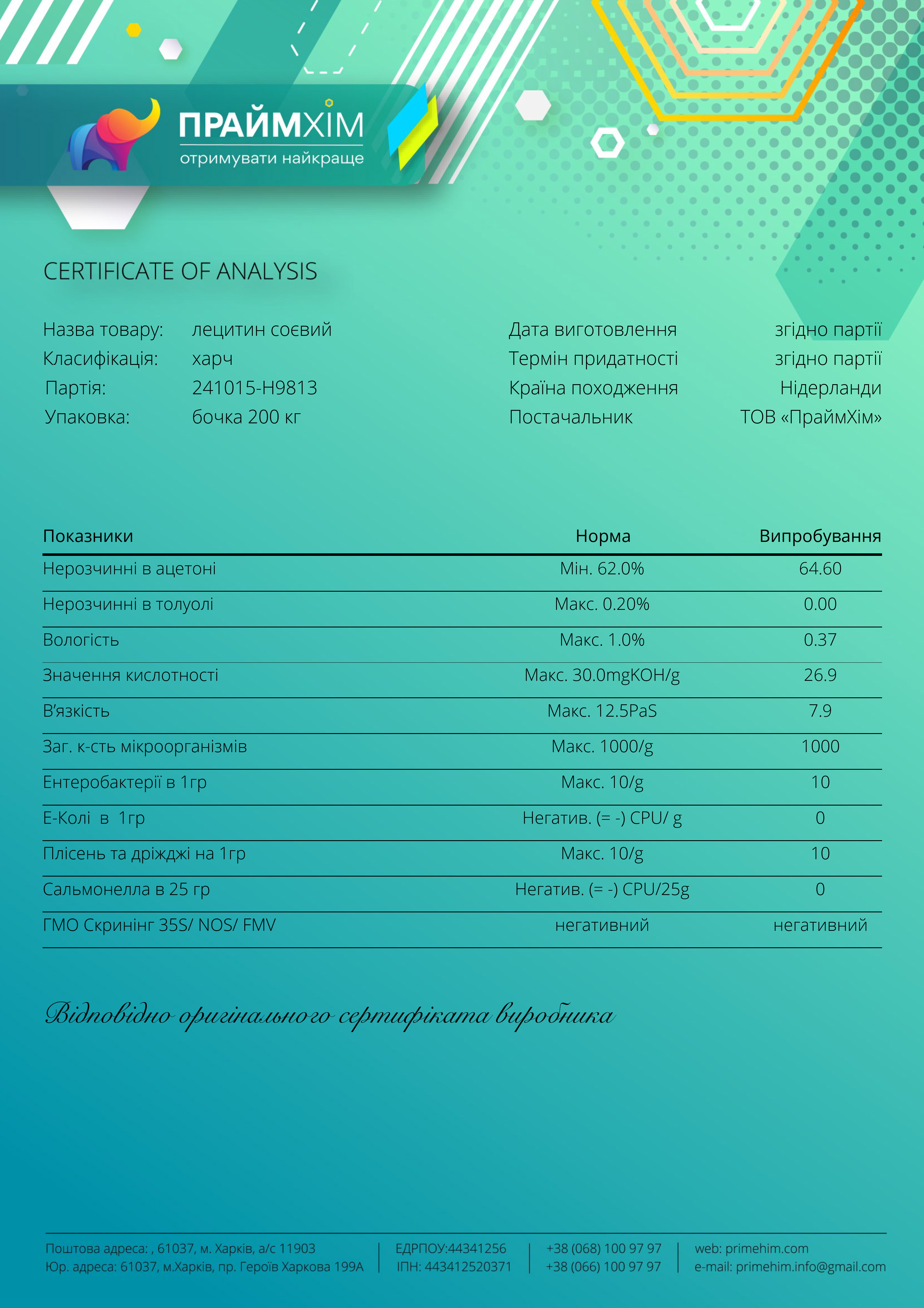 | Нерозчинні в ацетоні речовини (власне лецитин) | мін. 60-62% |